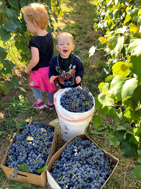At home they were quick to ask for a movie. After a minor disagreement about what movie would be entertaining they got to work. I think we got about 40 half gallons of juice. We always have grape juice with pizza. It's a favorite.