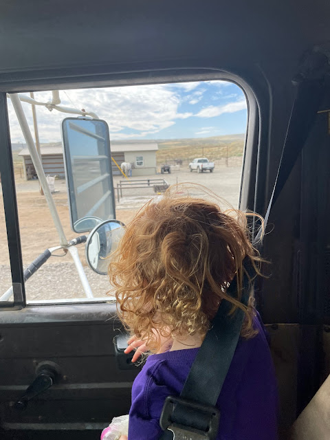 And the secret to our success chips. Lots of chips and some apples thrown in. I don't buy junk food as a rule it disappears so fast and isn't worth the cost. But desperate times call for desperate measures. The kids have been pretty content just being with us. We talk and observe. Andrea sits on my lap while at the feedlot and looks out the window or when Lia moves to the tractor she sits on the seat and can see out the window. She does really well.